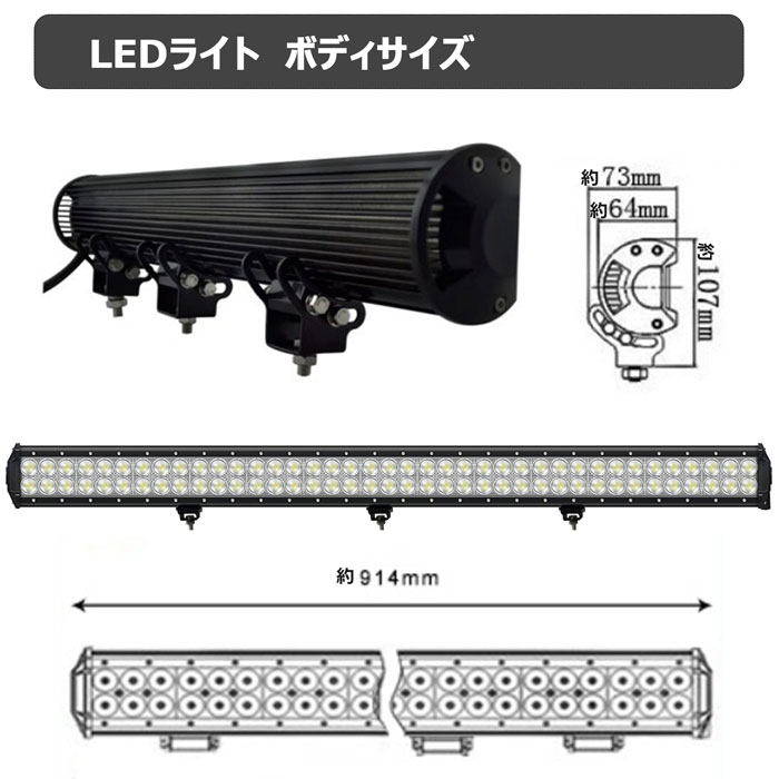 W数: 234W 動作電圧: 9V~32V 寿命: 約50,000時間 防水防震等級: IP67 本体材質: アルミ レンズ材質: ポリカーボネート樹脂(PC) 照射角: 広角60度 / 広狭角一体型 発光色: 6,500K ルーメン: 16,200-23,400lm サイズ: 914mm×107mm×73mm セット内容: 【新品】ランプ×1個、取り付けネジ×1式 保証期間: 1年保証 ※保証書の発行は致しておりません。配送伝票控えが保証書の代わりとなります。