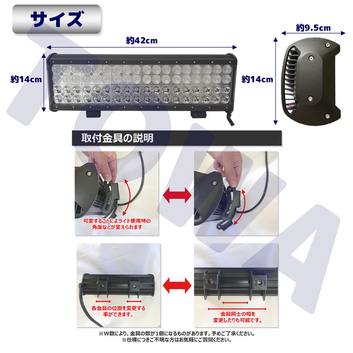 W数: 216W 動作電圧: 9V~32V 防水防震等級: IP67 本体材質: アルミ合金鋳造ボデイー レンズ材質: ポリカーボネート樹脂(PC) 照射角: 狭角タイプ / 広角タイプ / 広角狭角一体式タイプ 発光色: 6,500K ルーメン: 13,020-21,600lm サイズ: 440mm×167mm×93mm 取付金具: 304ステンレスブラケット セット内容: 【新品】ランプ1個、取り付けネジ×1式 保証期間: 1年保証 ※保証書の発行は致しておりません。配送伝票控えが保証書の代わりとなります。