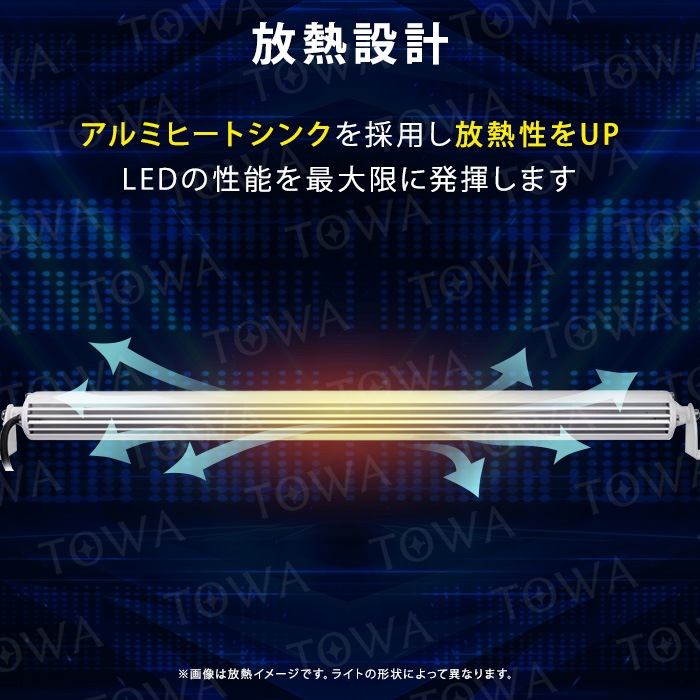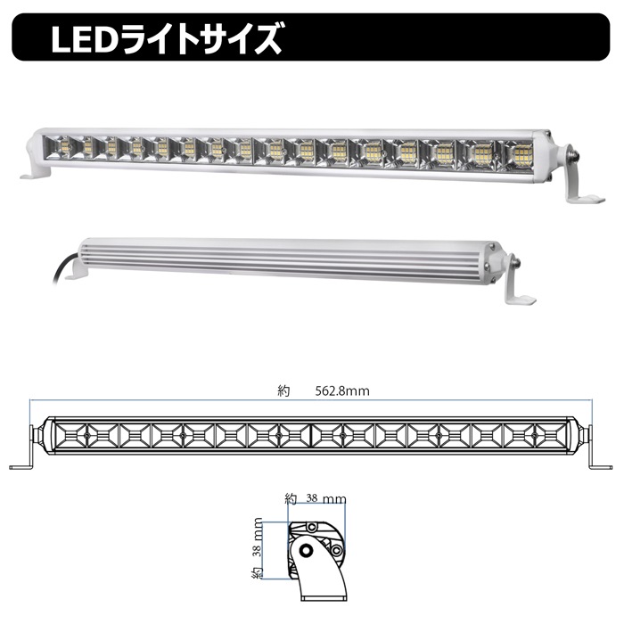 W数: 96W ノイズレス仕様 寿命: 約30,000時間 動作電圧: DC10V~30V 防水防震等級: IP67 本体材質: アルミ レンズ材質: pc 照射角: 広角タイプ60度 発光色: 6,000K ルーメン: 8,000lm 製品重量: 約0.9kg サイズ: 562.8mm×38mm×38mm セット内容: 【新品】ランプ1個、ステンレス取り付けネジ×1式 保証期間: 1年保証 ※保証書の発行は致しておりません。配送伝票控えが保証書の代わりとなります。