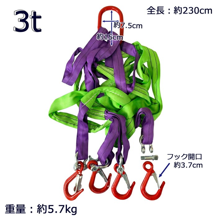 スリングベルト 4本吊り ベルト式 工具 吊具 フック付 ネジシャックル式 4本吊り 吊り具 2.3m 3000kg 3t フックは着脱出来ます