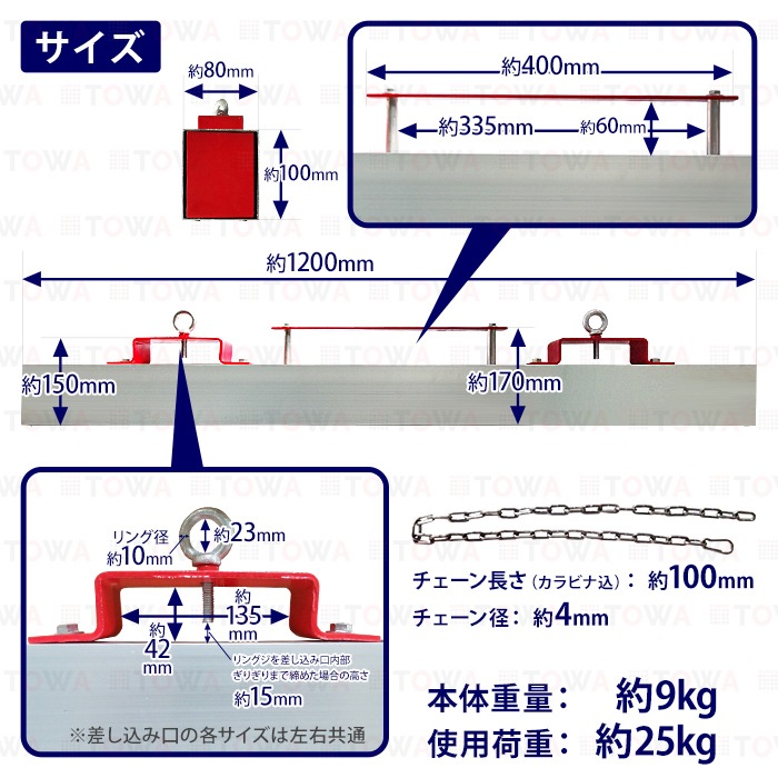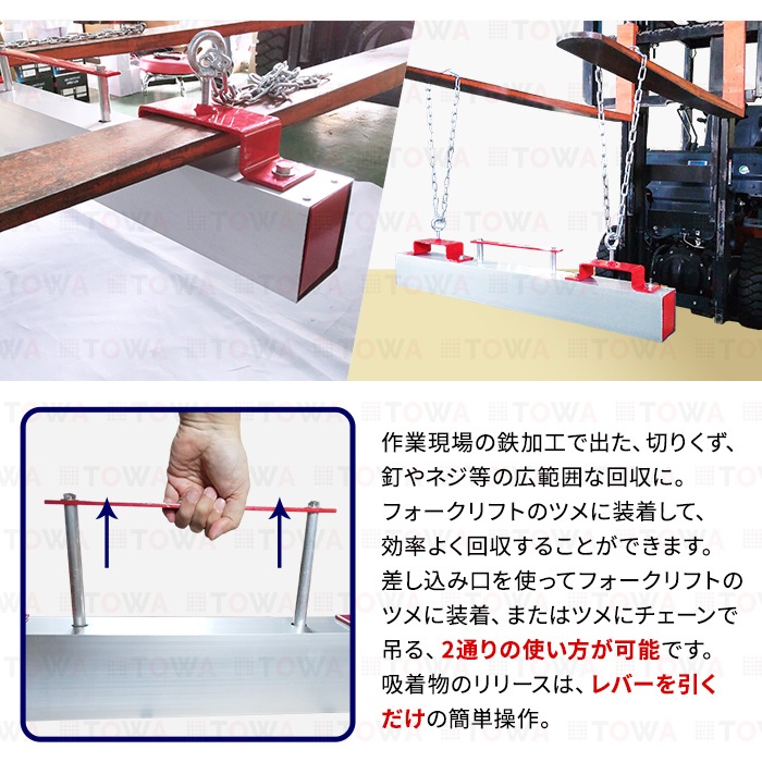 マグネットスイーパー フォークリフト用 金属と非金属の選別 長さ約1200mm 1.2m 吸着力約25kg フェライト 磁石 アタッチメント ネジ 釘 鉄 クズ くず 鉄片 鉄粉 選別 工場
