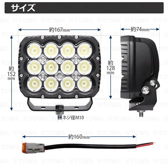 W数: 120WLuminus製10W型チップ×12PCS ノイズレス仕様 寿命: 約30,000時間 動作電圧: 10V~30V 使用温度: -40度~85度 防水防震等級: IP67 本体材質: アルミ合金鋳造ボデイー レンズ材質: ポリカーボネート樹脂(PC) 取付金具: 304ステンレスブラケット 照射角: 広角タイプ 発光色: 6,000K ルーメン: 9500lm 製品重量: 約1.6kg(金具付) サイズ: 約167×74×152mm セット内容: 【新品】ランプ1個、取り付けネジ×1式 保証期間: 1年保証 ※保証書の発行は致しておりません。配送伝票控えが保証書の代わりとなります。