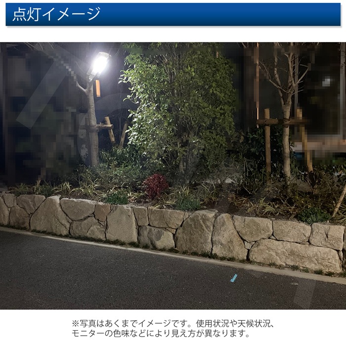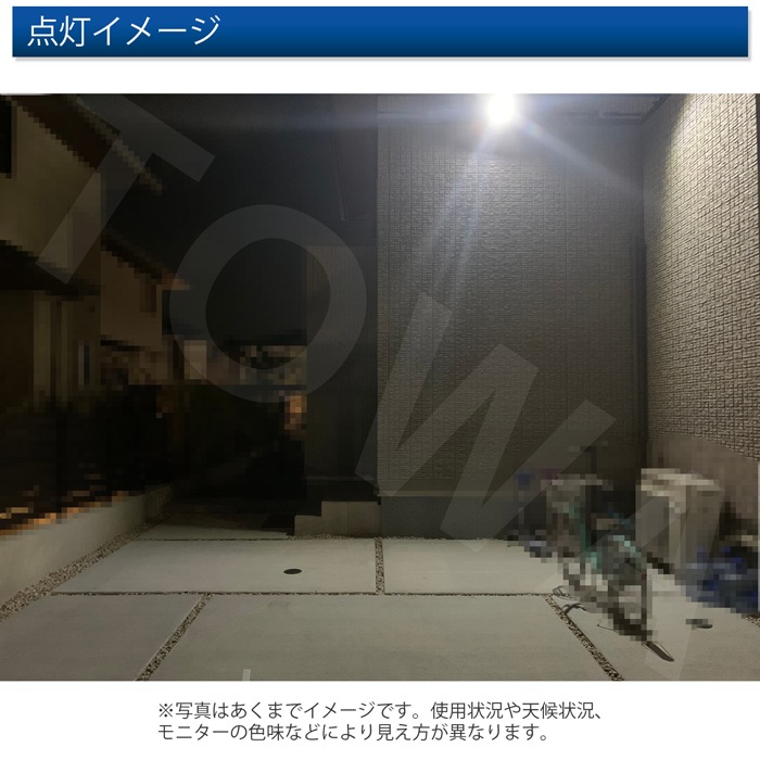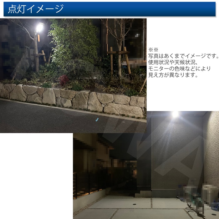 - 夕方一定の暗さになると明暗センサーが働いて50%の照度で自動点灯し、更に人感センサーは動きが検出されたら100%の照度で点灯します。
