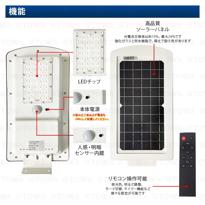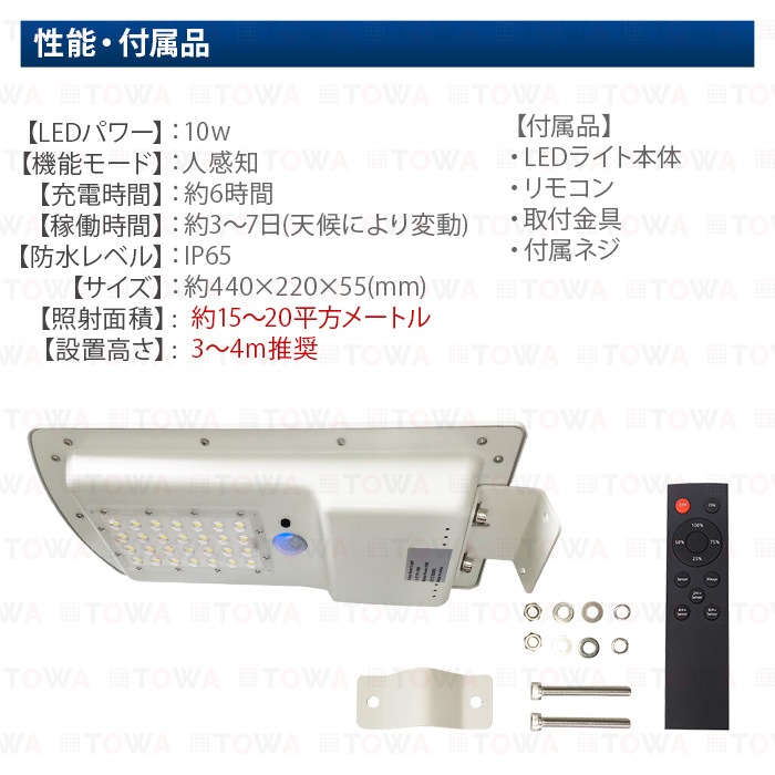 LED街灯 ソーラーライト 屋外 防水 10W ガーデンライト 駐車場灯 センサーライト リモコン操作 庭先灯 防犯灯 庭先灯 駐車場灯 歩道灯 玄関 庭 看板