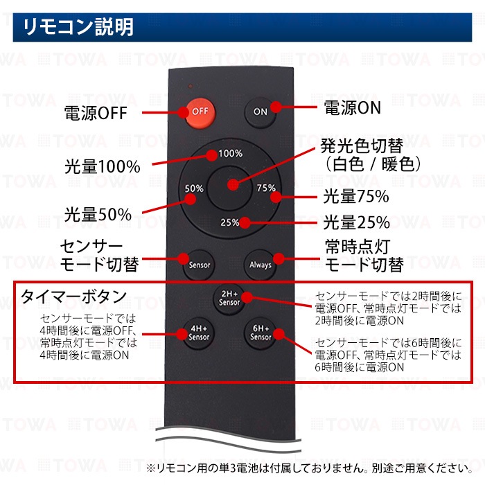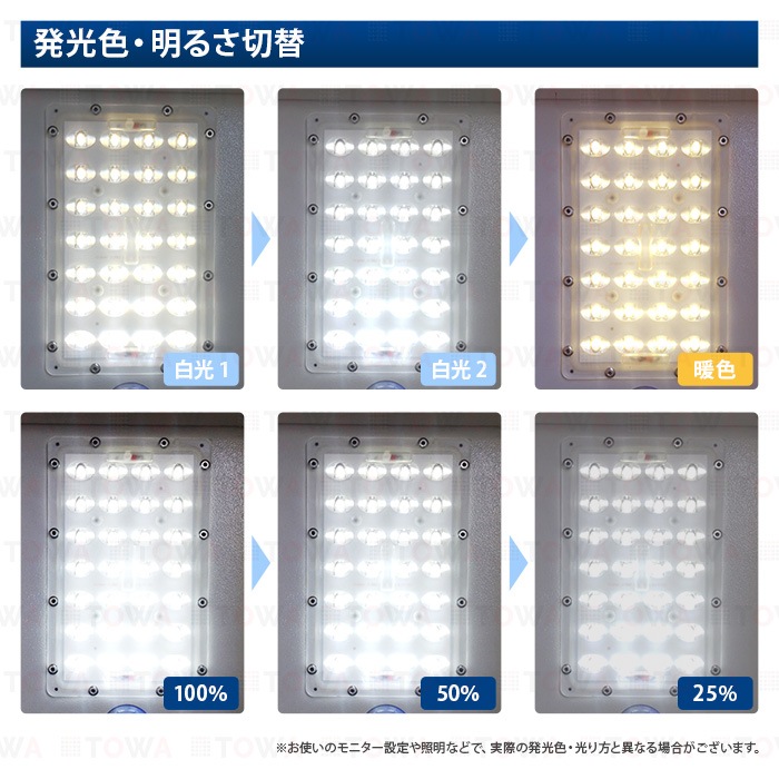 - 冬は太陽光線が弱いため、太陽電池パネルの変換能力が低下し、十分に充電できない為、照明時間が短くなります。